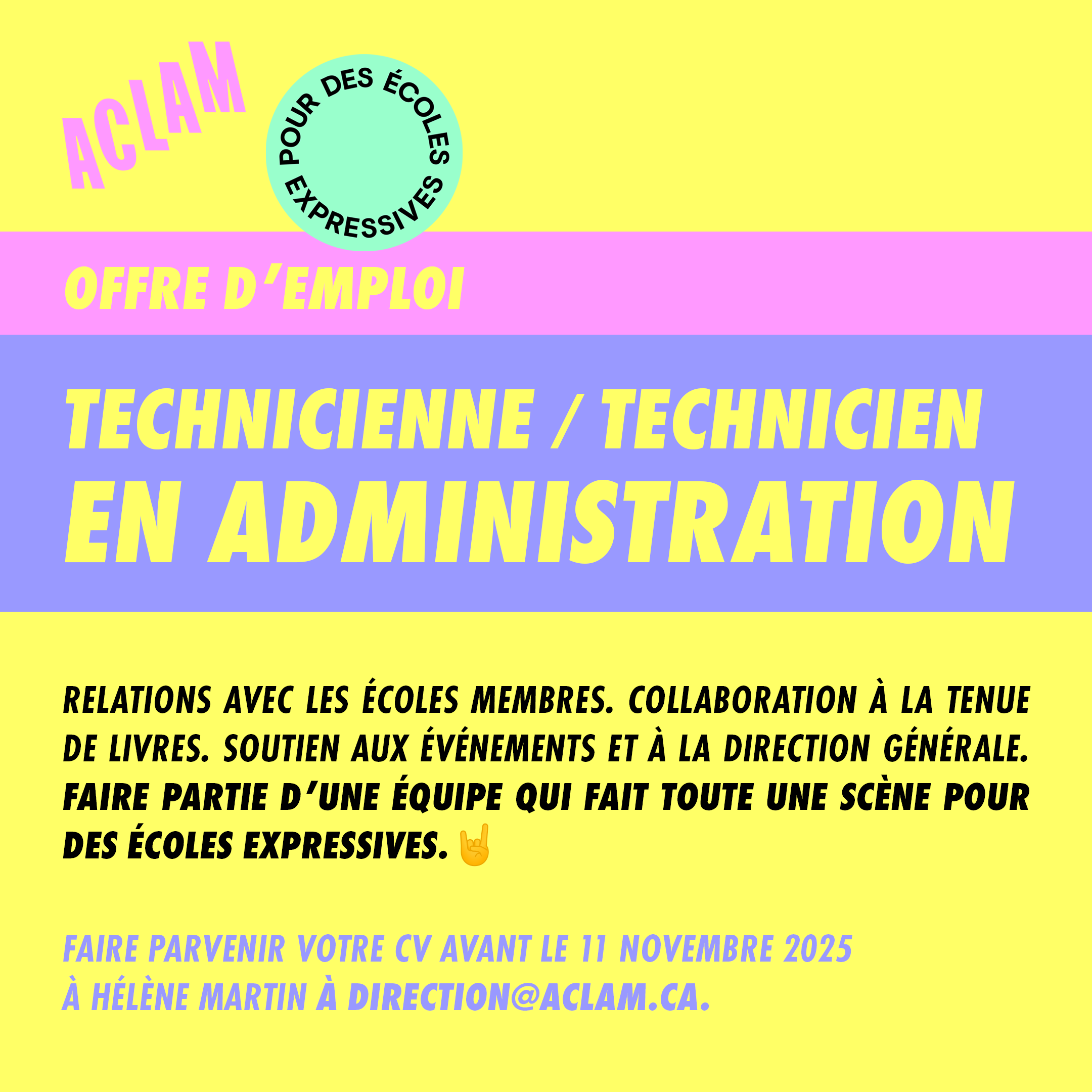 Faire parvenir votre CV avant le 11 novembre 2025 à Hélène Martin, directrice générale, à direction@aclam.ca.