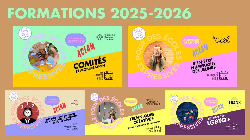 Parce qu’ACLAM croit que des intervenants socioculturels formés, outillés et valorisés sont le gage d’écoles expressives, la communauté de pratique offre une programmation unique en son genre d’ateliers, de tables rondes virtuelles et d’occasions de réseautage.