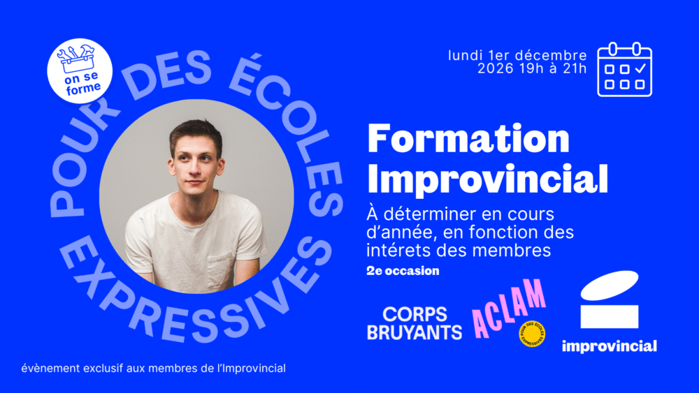 Vous vous demandez comment transformer les concepts d’impro en activitĂ©s pertinentes pour vos pratiques? Cette formation s’adresse aux entraĂ®neuses et entraĂ®neurs d’impro qui souhaitent dynamiser, renouveler et inventer de nouveaux exercices ciblĂ©s et engageants pour les jeunes. Rafael Poggetti de l’école Corps bruyants vous propose de rĂ©flĂ©chir aux concepts d’impro qui vous tiennent Ă cĹ“ur et Ă les transformer en des activitĂ©s propices et pertinentes.