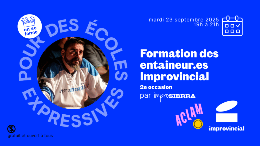 La formation en ligne pour les entraîneuses et entraîneurs du secondaire vous est proposée par Impro Sierra, pour bien débuter votre rentrée. Que vous en soyez à votre première expérience ou non, cette formation permet aux participants de structurer leur année. Dirigée par Roberto Sierra, la formation vous donnera une vue d’ensemble pour planifier la progression de votre groupe et pour trouver des solutions aux différentes embûches que vous rencontrerez en cours de chemin. C’est aussi un moment idéal pour échanger entre formateurs sur le plan des façons de faire et des exercices utilisés en ateliers. On vous aidera même à n’en trouver des nouveaux.